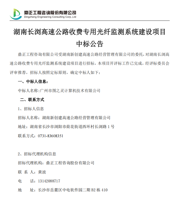 湖南長瀏高速公路收費專用光纖監測系統建設項目中標公告